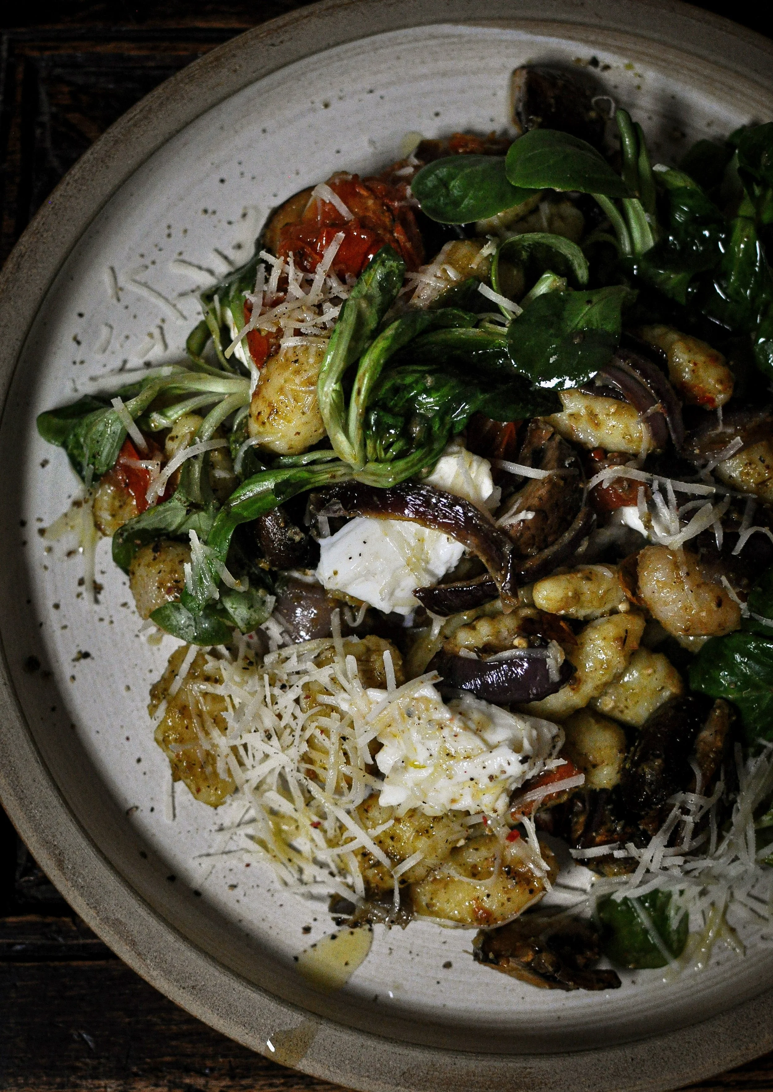 四月はよく、クリスにペストニョッキを作ってもらいました。ローストした野菜やキノコにモツァレラチーズをトッピング。夏には、家庭菜園の野菜が使えますように!