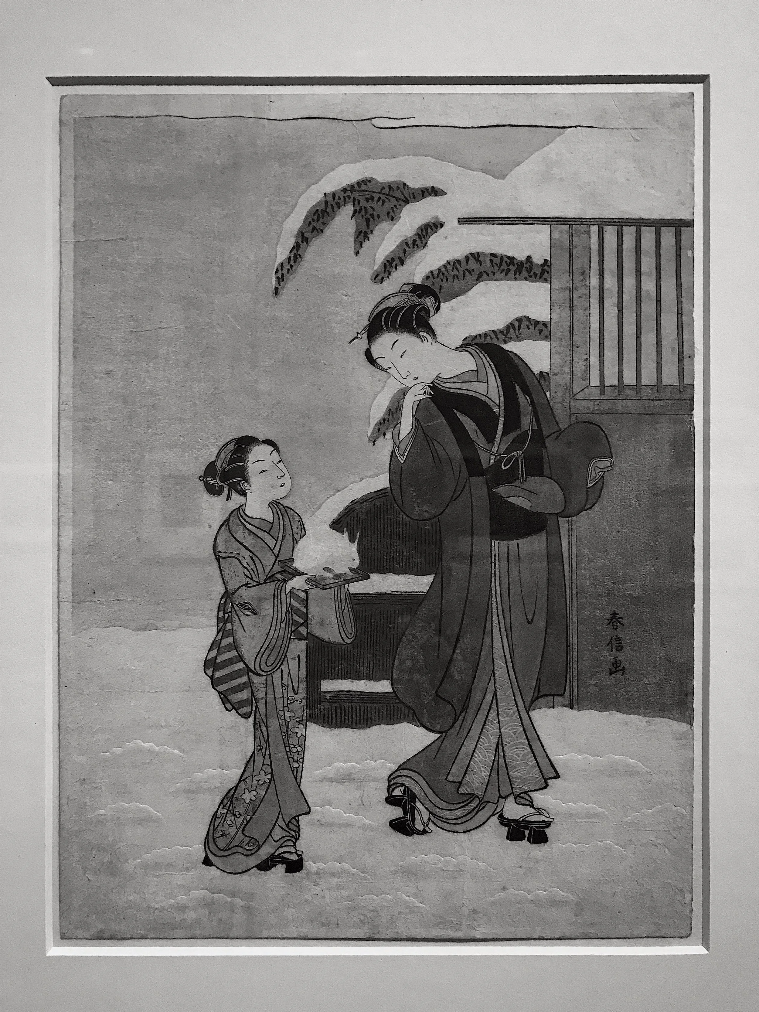 もう一枚は、鈴木春信 “雪うさぎを愛でる娘”。雪の降り積もった地面の描写を珍しいエンボス加工で表現していた版画。この作品は雪月花を表しているそう。雪景色、月のシンボルうさぎ。そして娘が着ている着物の柄が桜です。
