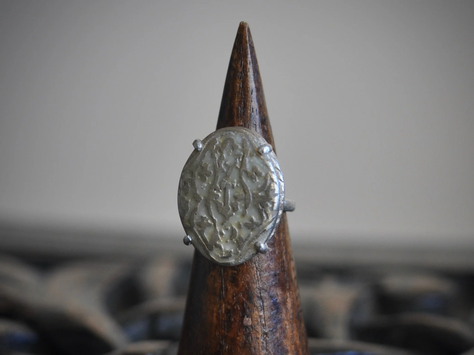 啓蟄に因み、昆虫の3対6本脚を模した爪留めの燻リング。