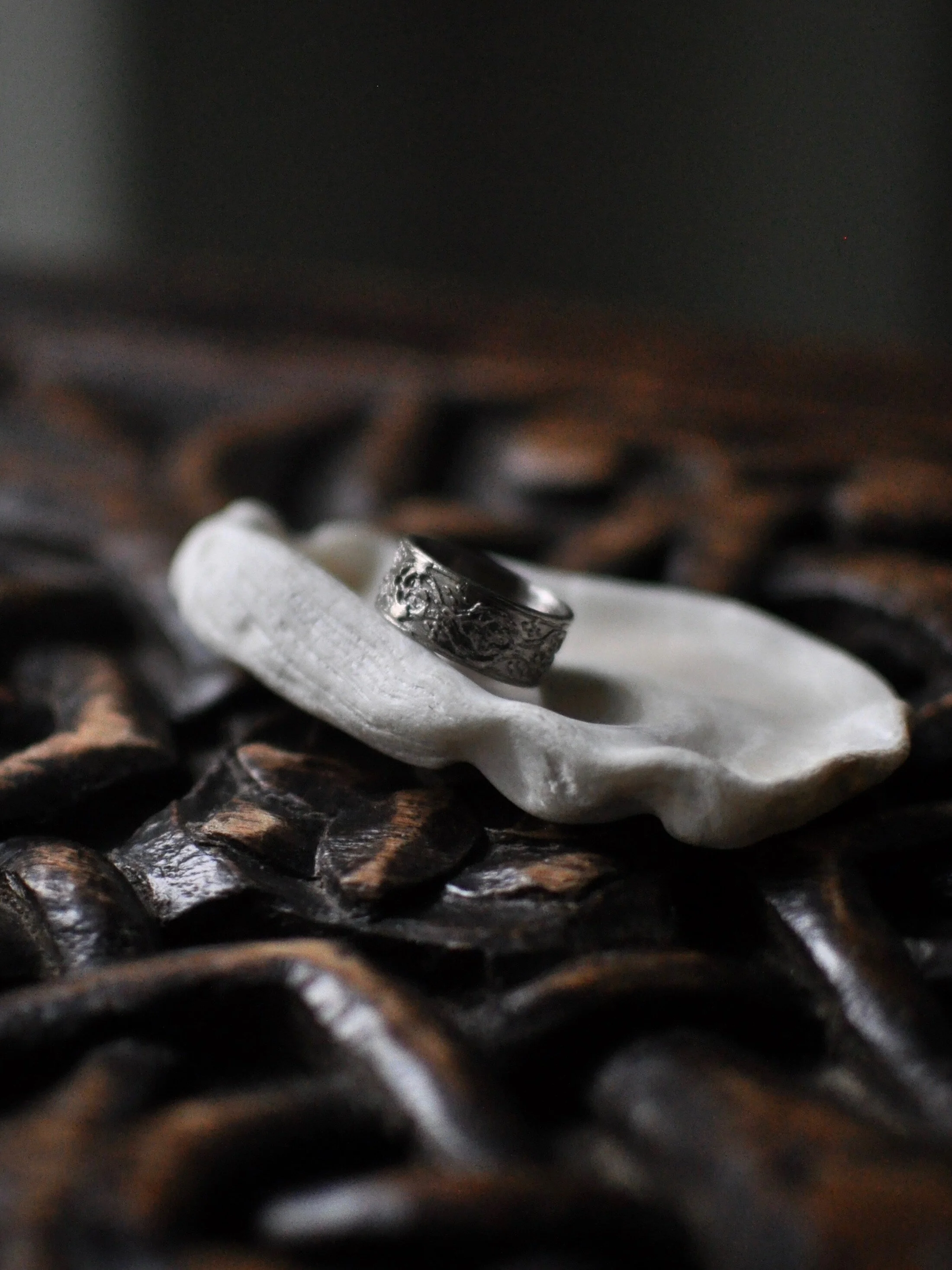 手作りならではのナチュラルな質感のシルバーリングです。ユニークなウェディングリングとして、又はチェーンを通しペンダントヘッドとしてギフトとしてもご使用いただけます。こちらのパターンは珍しいソーラーエッチングという太陽の光を利用してデザインされたものです。指輪の内側は刷毛目テクスチャーでコンテンポラリーなイメージを施しています。エッジには丁寧に丸みをつけスムースな着け心地です。